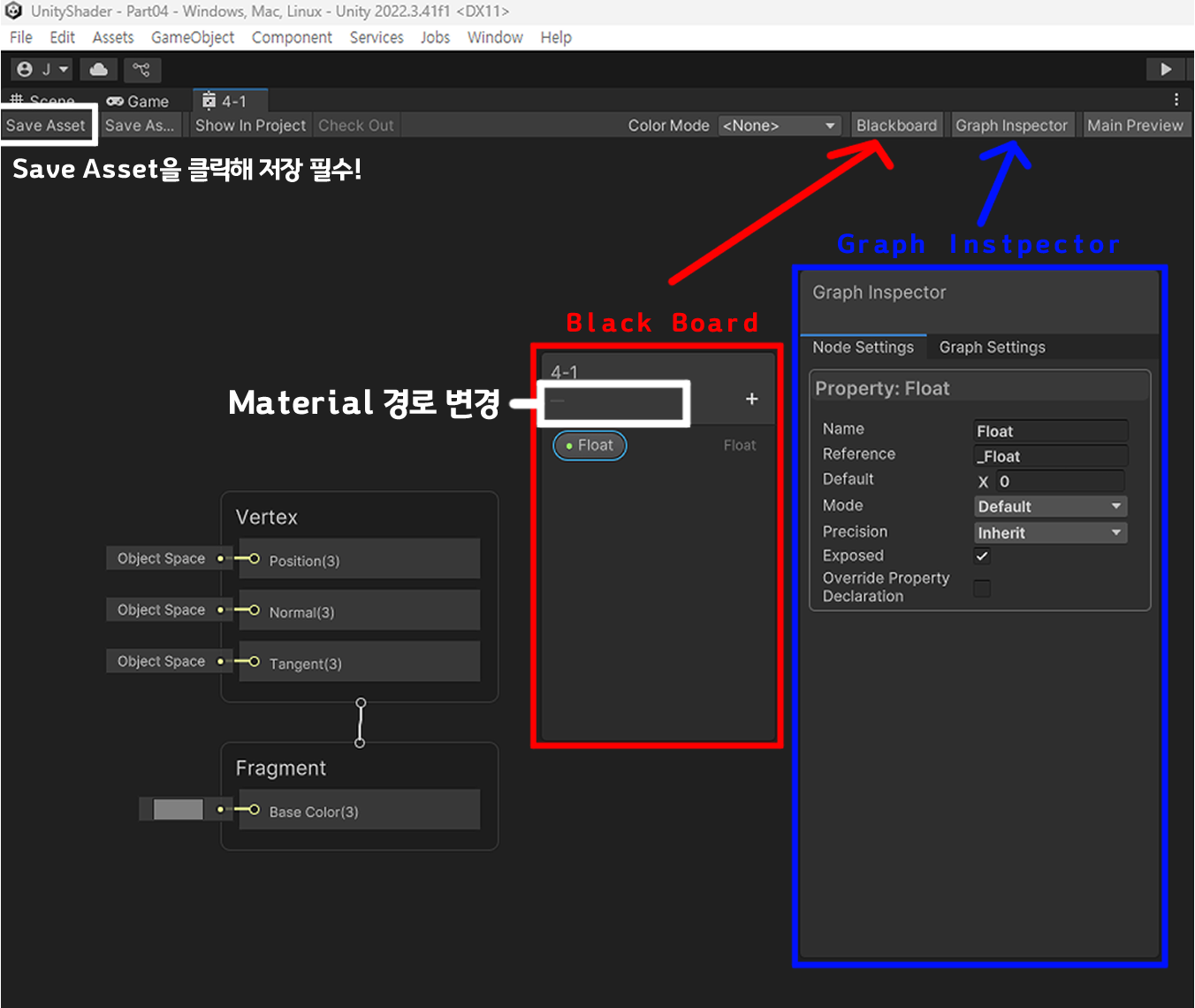 - 따라서 이 메테리얼의 경로를 직접 변경할 수 없으며, 셰이더 그래프 내에서만 경로를 수정할 수 있다.