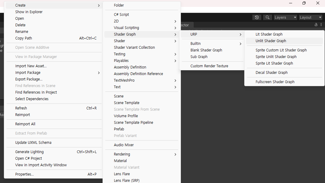- Project 에서 마우스 오른쪽 - Create - Shader Graph - URP - 원하는 셰이더 그래프 선택 (필자는 Unlit Shader Graph를 선택함)