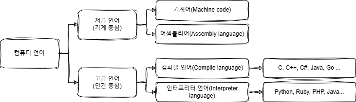 - 인터프리터 언어 : 인터프리터(Interpreter)에 의해 소스 코드가 한 줄씩 실행되는 고급 언어