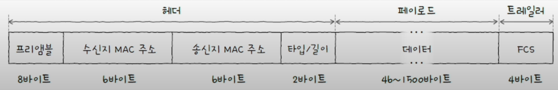 - 헤더 : 프리앰블, 수신지 MAC 주소, 송신지 MAC 주소, 타입/길이