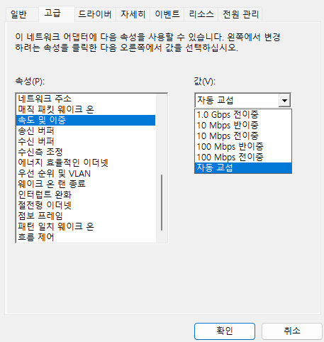 내 컴퓨터에서 duplex 찾아보기 장치관리자 - 네트워크 어댑터 - 속성 - Speed & Duplex 충돌(collision) 문제