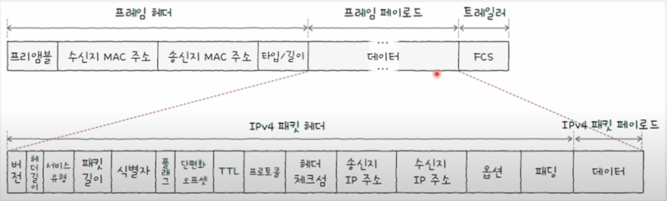페이로드의 데이터 크기는 46~1500byte IPv4 (IP version.4)