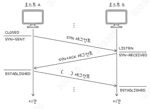 보기의 그림은 TCP 연결 수립 상태를 나타낸다.
