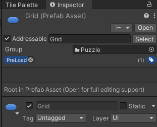 - 아래와 같은 그룹 패널창이 나타나는데, Addressable 기능을 사용할 리소스들은 Addressable 체크 박스에 체크를 해줘야 한다. 체크하면 Groups 목록에 나타난다.