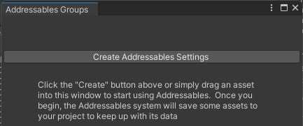 - 위에서 Groups 를 클릭하면 해당 창 생성. Create Addressables Settings 클릭