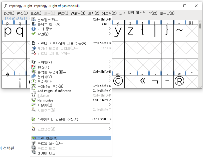 그 상태에서 요소 - 폰트 결합 을 클릭해 합치고 싶은 폰트를 불러와주면 합쳐진다고 하는데...