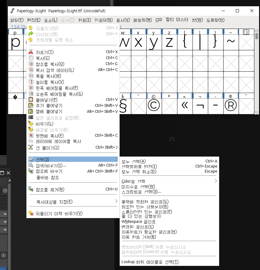 편집 - 선택 - 스플라인만 있는 글리프 를 클릭하고, 이어서 편집 - 선택 - 선택범위를 반전 을 클릭해주면 비어있는 글자들이 선택된다.
