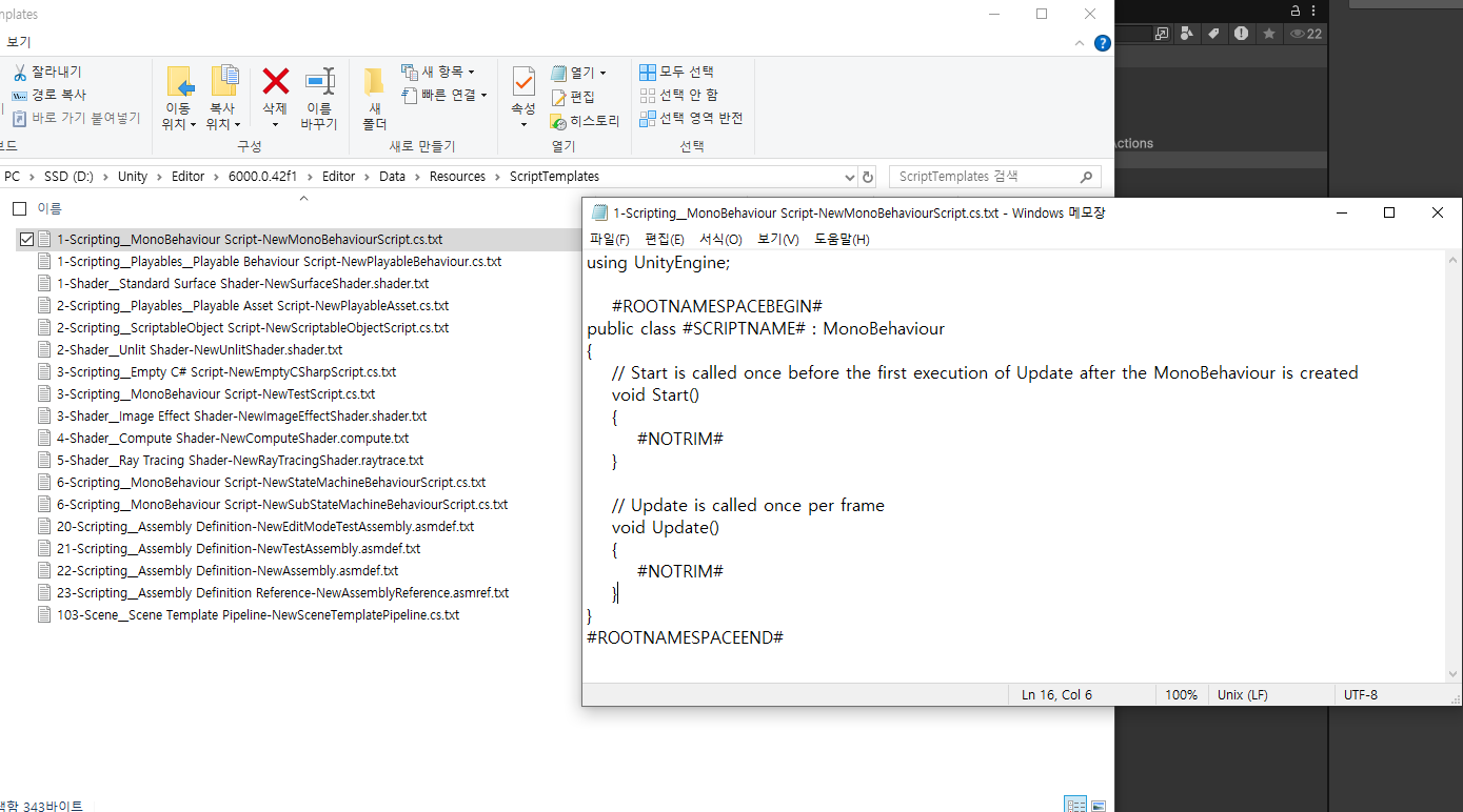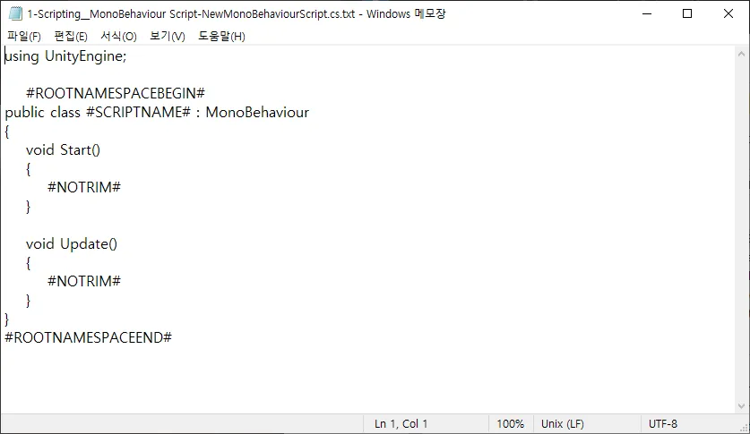 3. 그 중 첫 번째 파일인 MonoBehaviour 스크립트를 선택하고 메모장으로 열어주면 아래와 같은 내용이 뜬다.