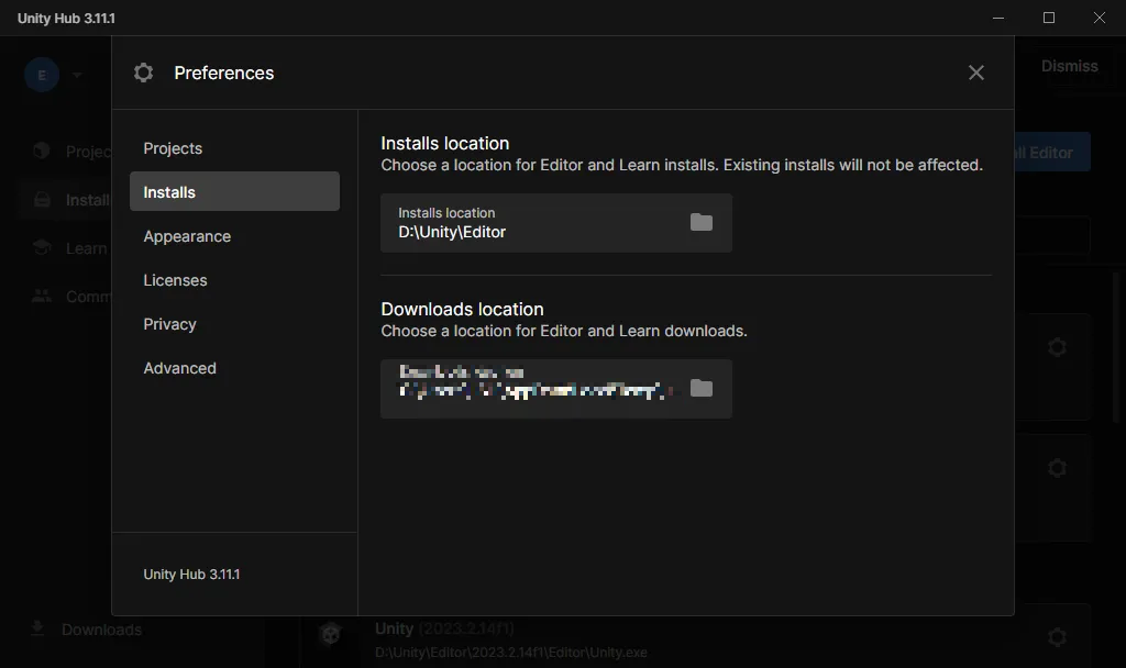 유니티 허브 설정에 들어가서도 확인할 수 있다.